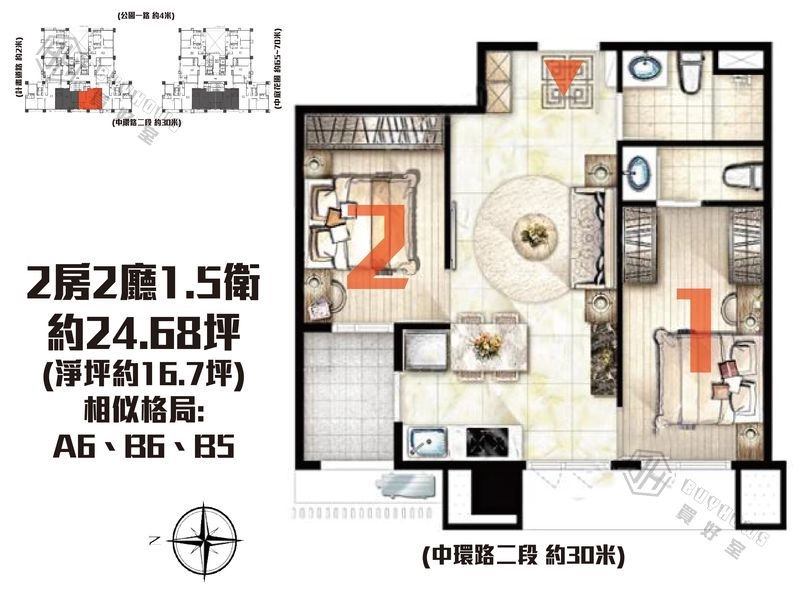 2房/ 2廳/ 2衛/ 1陽台